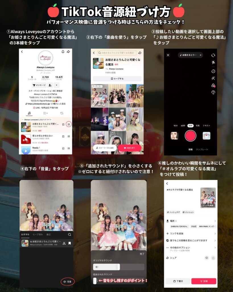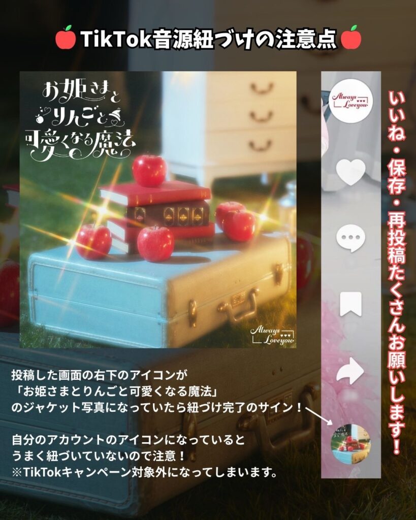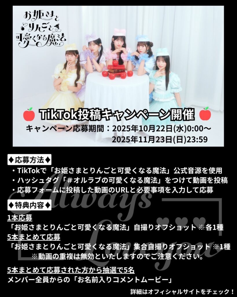 ※先行配信期間中(10/6(月)~21(火)まで)に「お姫さまとりんごと可愛くなる魔法」を紐付け、ハッシュタグ「#オルラブの可愛くなる魔法」をつけて投稿した動画も対象!