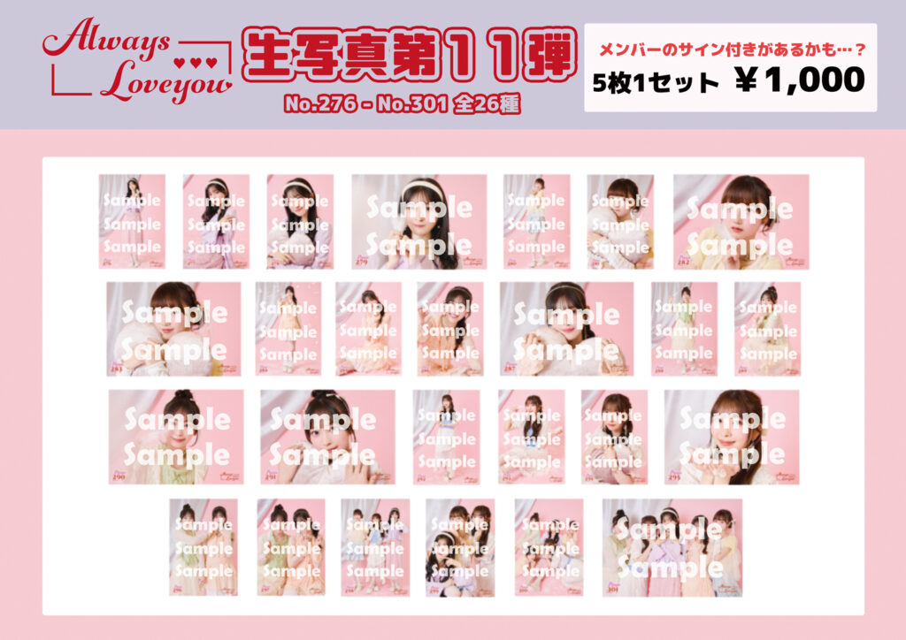 「生写真5枚1セット第11弾」3セットを予約購入いただくと、選択したメンバーとの2ショットトーク(45秒)ができる特典会となります。